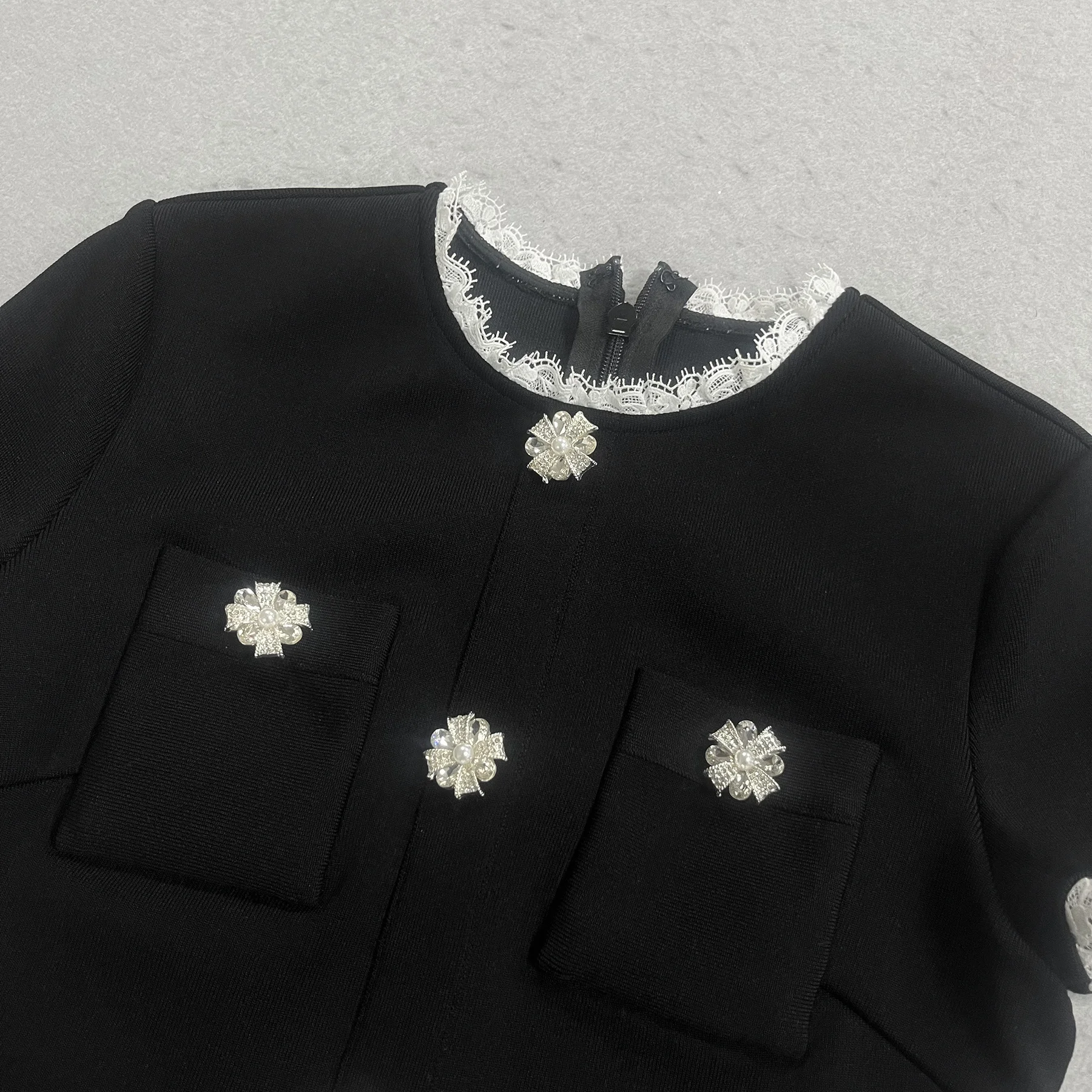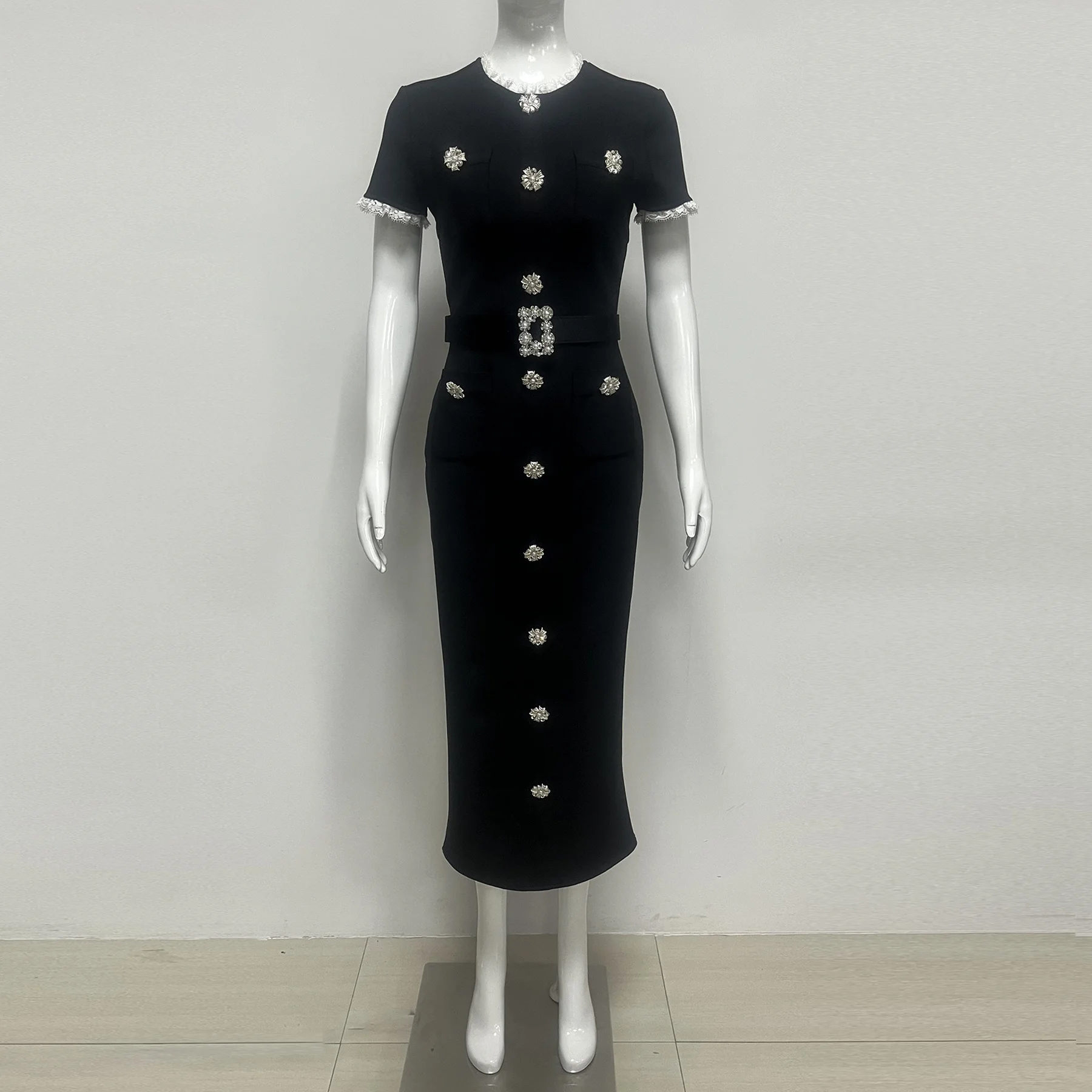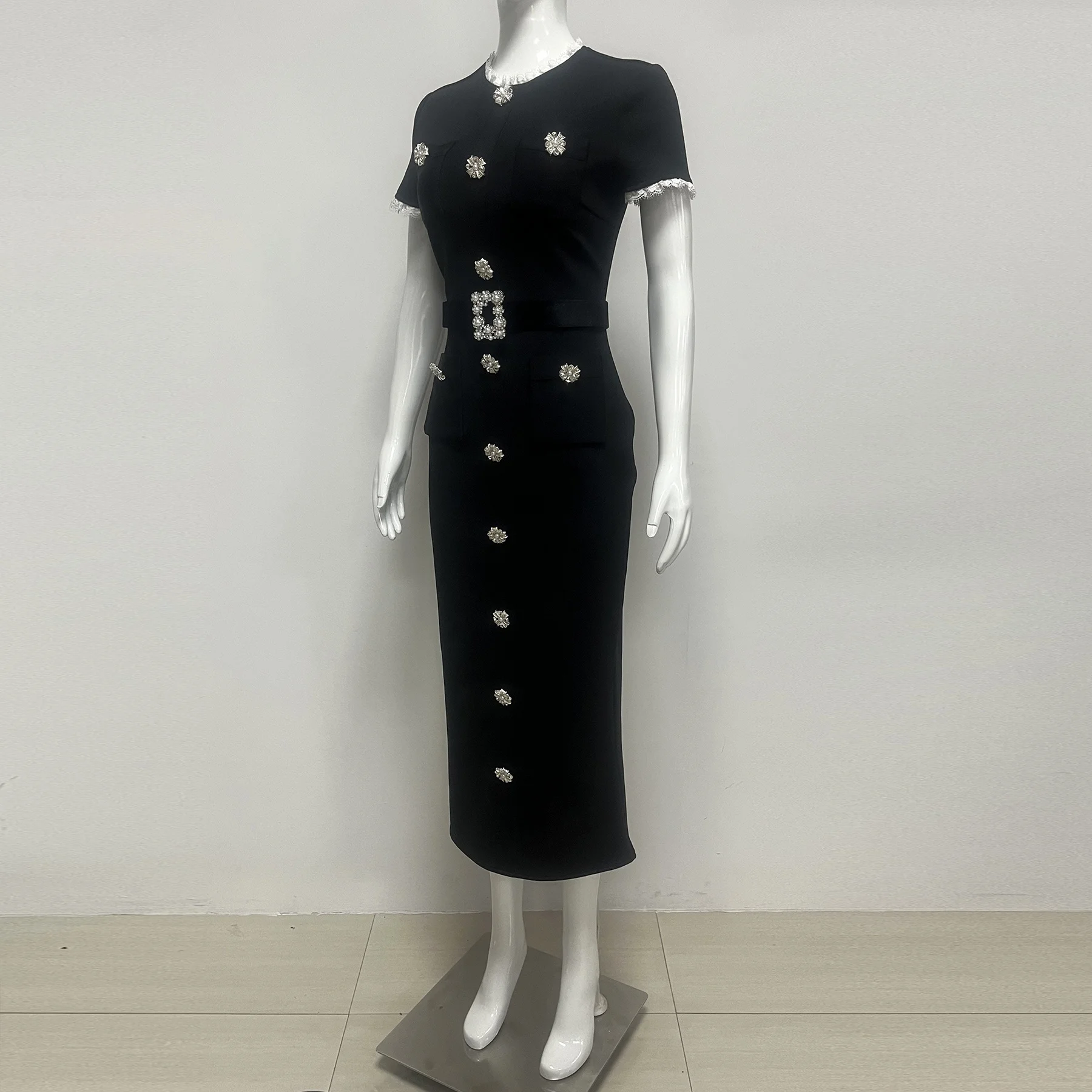 Black Embellished Midi Dress, Short Sleeve ,Belted Crystal