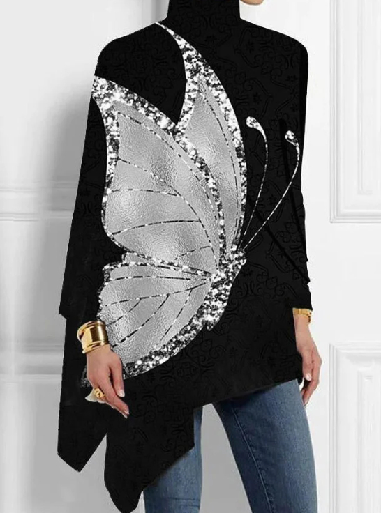 Butterfly Print Turtleneck Asymmetrical Top For Spring Autumn