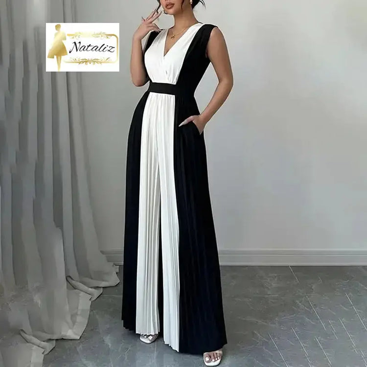 Color Block Slim Women Pleated High Wide Leg Jumpsuit