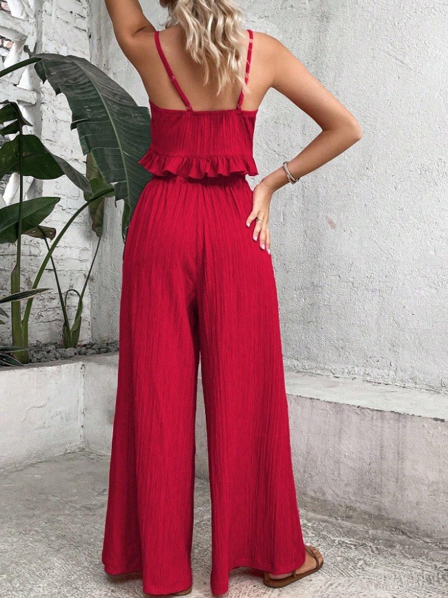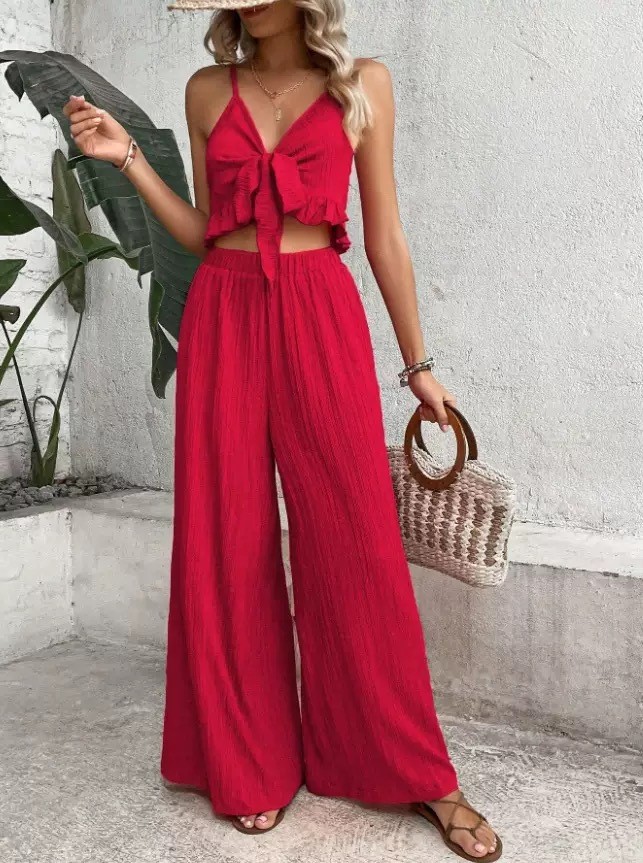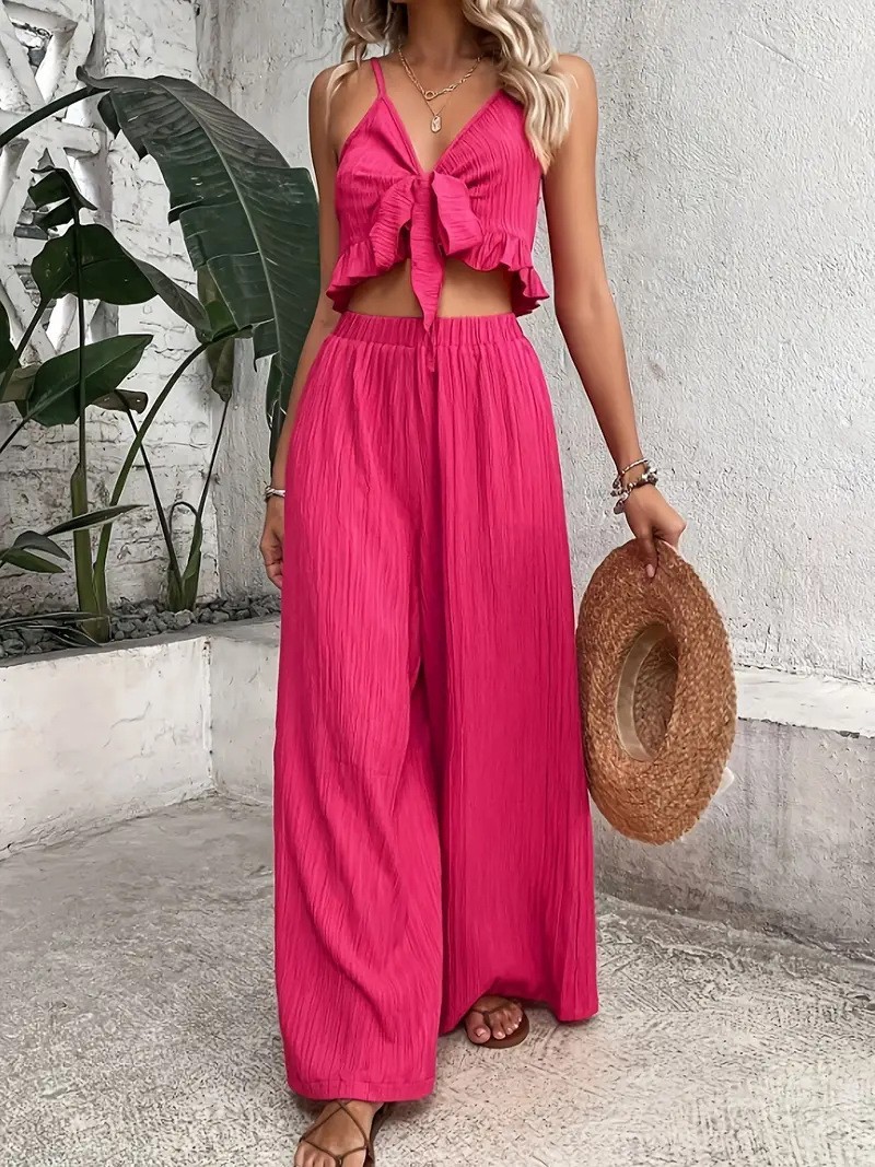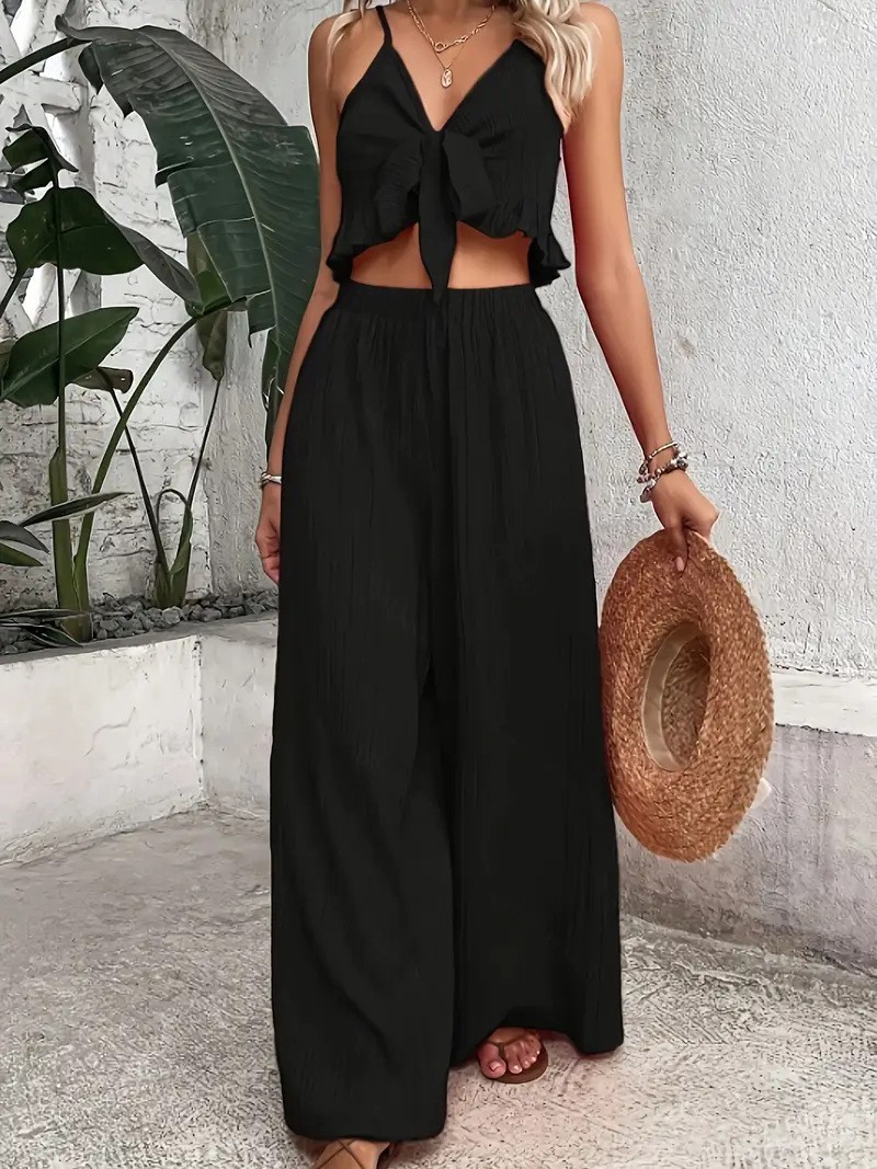 Elegant Solid-color Two-piece Set A V-neck Slip Top With Tie Details And Wide-leg Trousers