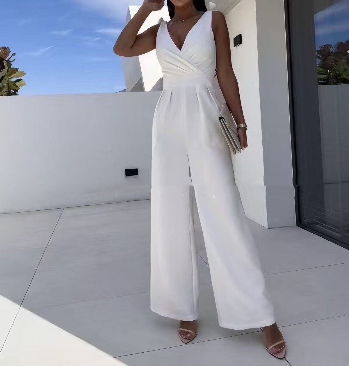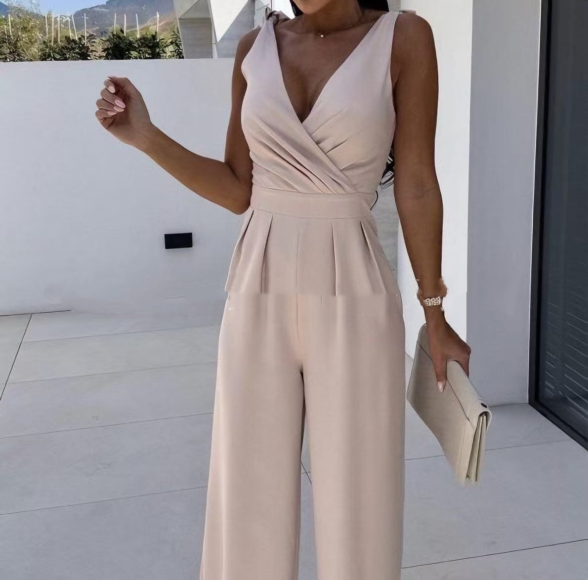 Fashionable Solid-Color V-Neck Sleeveless Long Jumpsuit