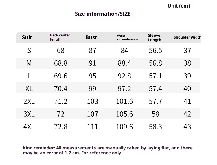1. Asian sizes are 1 to 2 sizes smaller than European and American people. Choose the larger size if your size between two sizes. Please allow 2-3cm differences due to manual measurement. 2. Please check the size chart carefully before you buy the item, if you don't know how to choose size, please contact our customer service. 3.As you know, the different computers display colors differently, the color of the actual item may vary slightly from the following images.