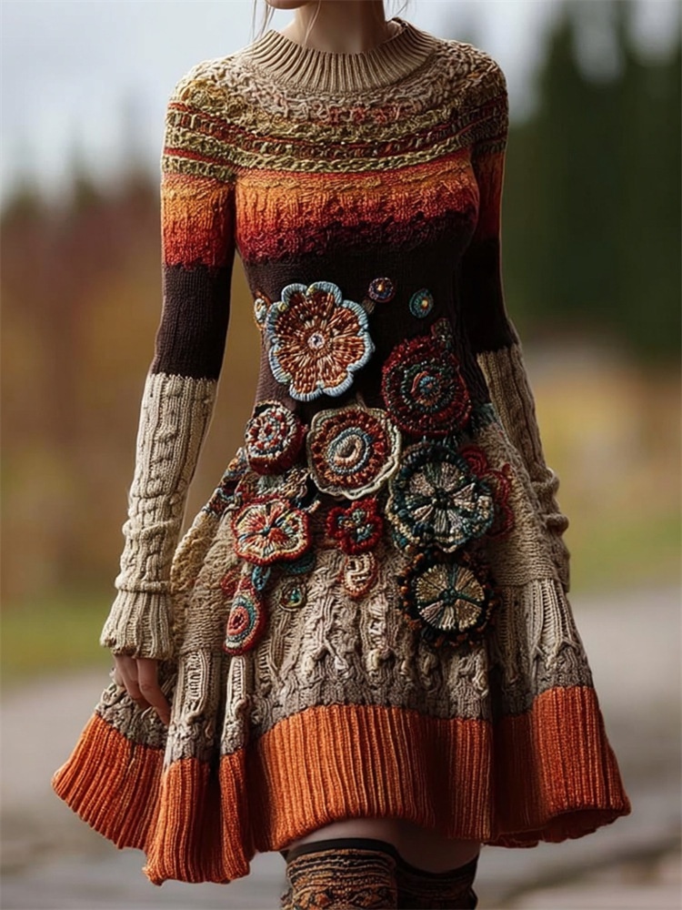 High-neck Sweater Dress Vintage Cable-knit Long-sleeve