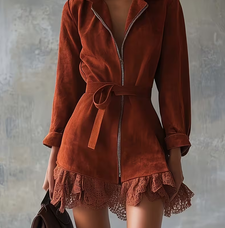 Details highlights: front center zipper closure (easy to put on and take off), skirt hem spliced with same-color lace (adding a soft touch), cuffs can be folded to reveal contrasting edges (enhancing layering).