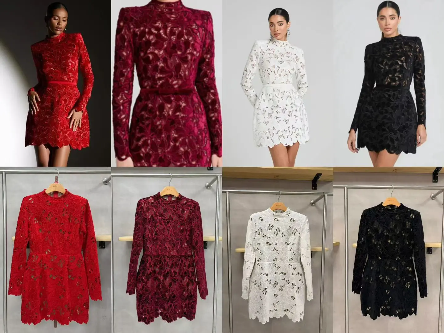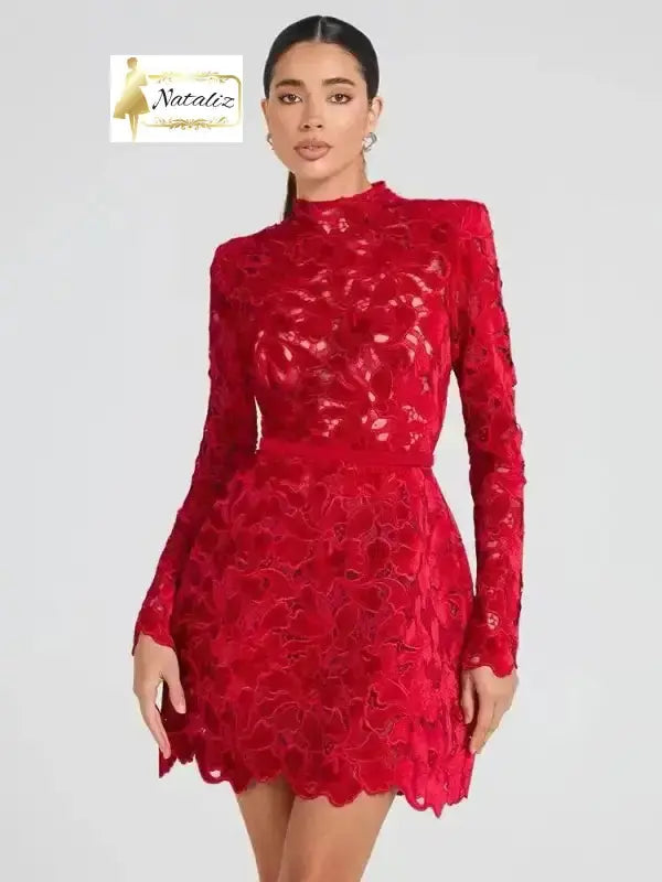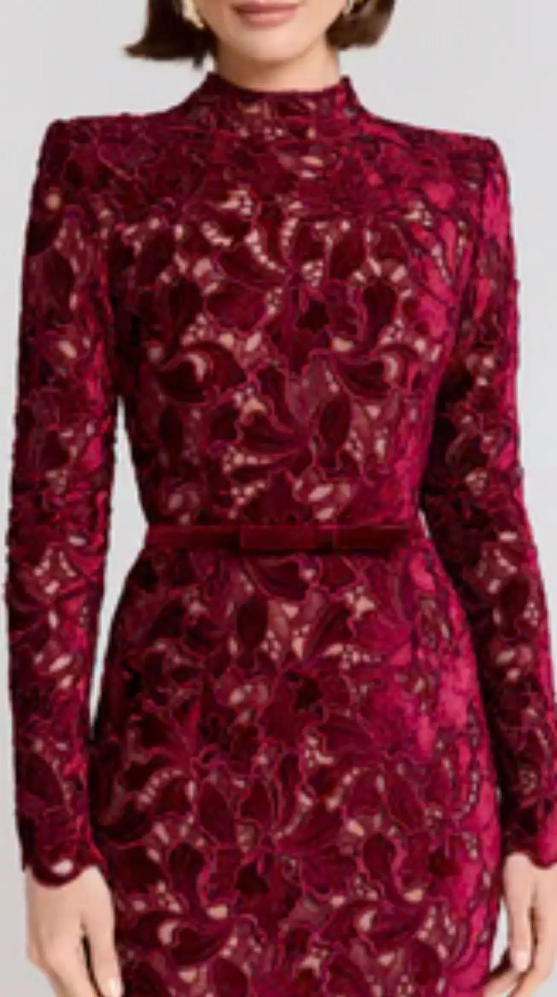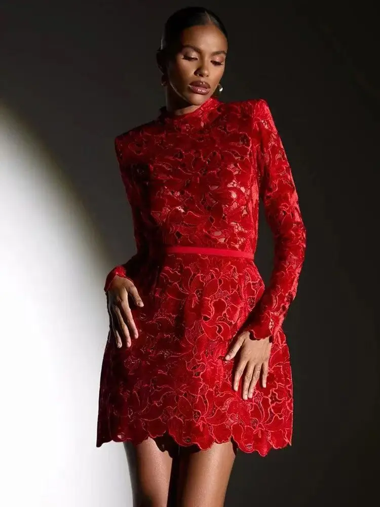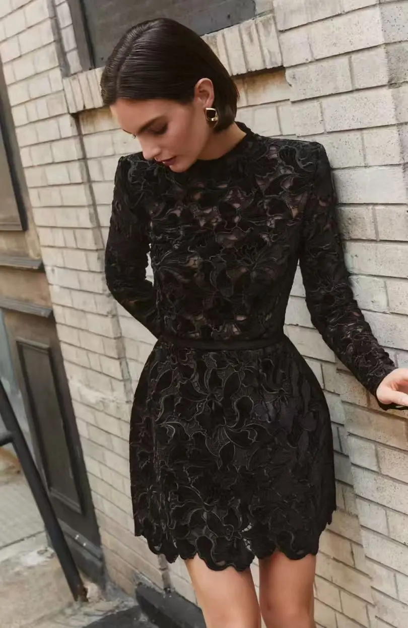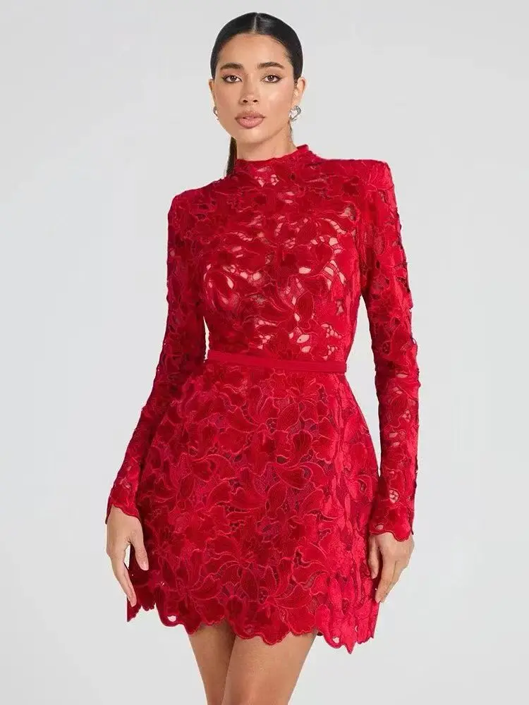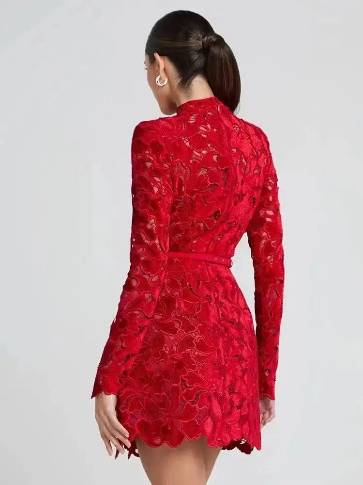 Lace Waist-Cinched Long Sleeves Mini Dress