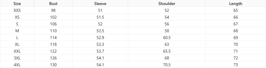 Sizes: 2XS, XS, S, M, L, XL, 2XL, 3XL, 4XL