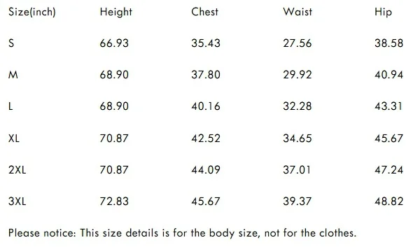 Note: Please compare your body measurements with our size chart before order! 1: 1inch=2.54CM, 1CM=0.39inch,Take below Size Conversion Chart as reference.2: All the size is provided for your reference, 1-3cm error should be accepted.