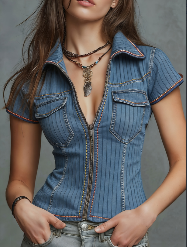 Short-sleeved Shirt With Lapel, Zipper, Waist-cinching, Short Length And Multi-style Design