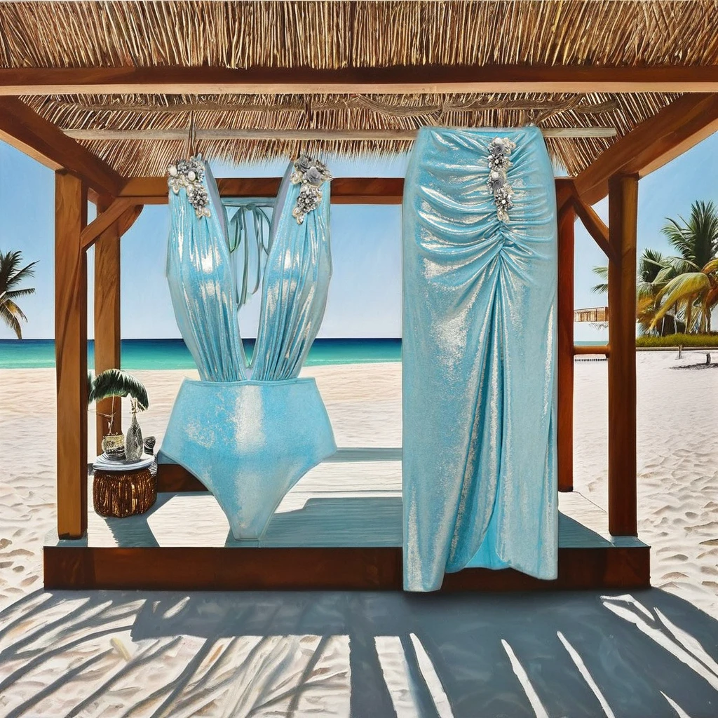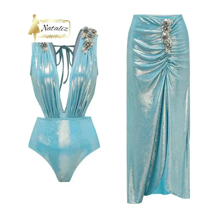 Solid Color Glossy One-Piece Swimsuit Deep V 2-Piece Set