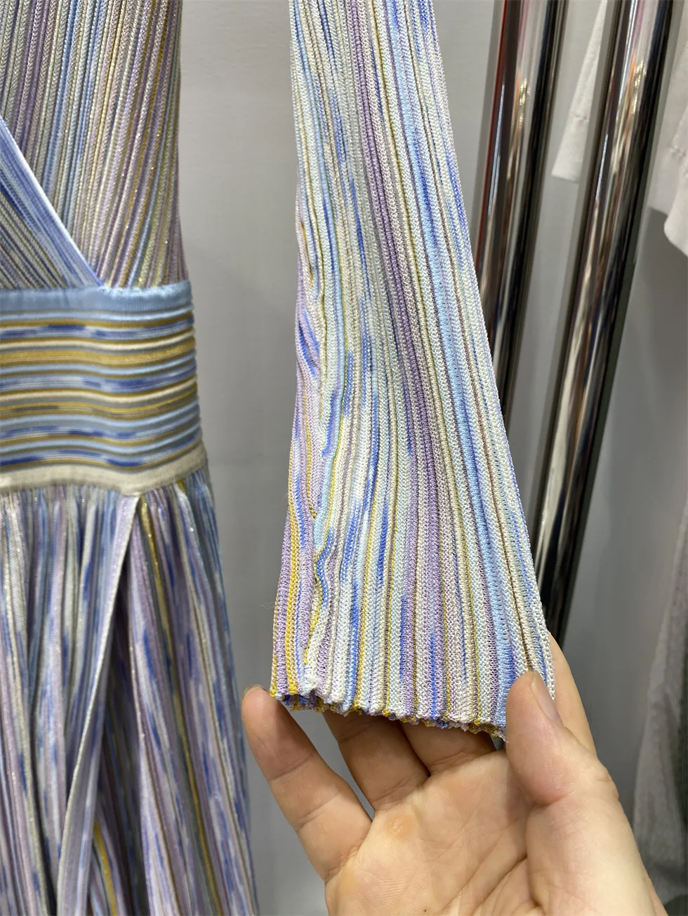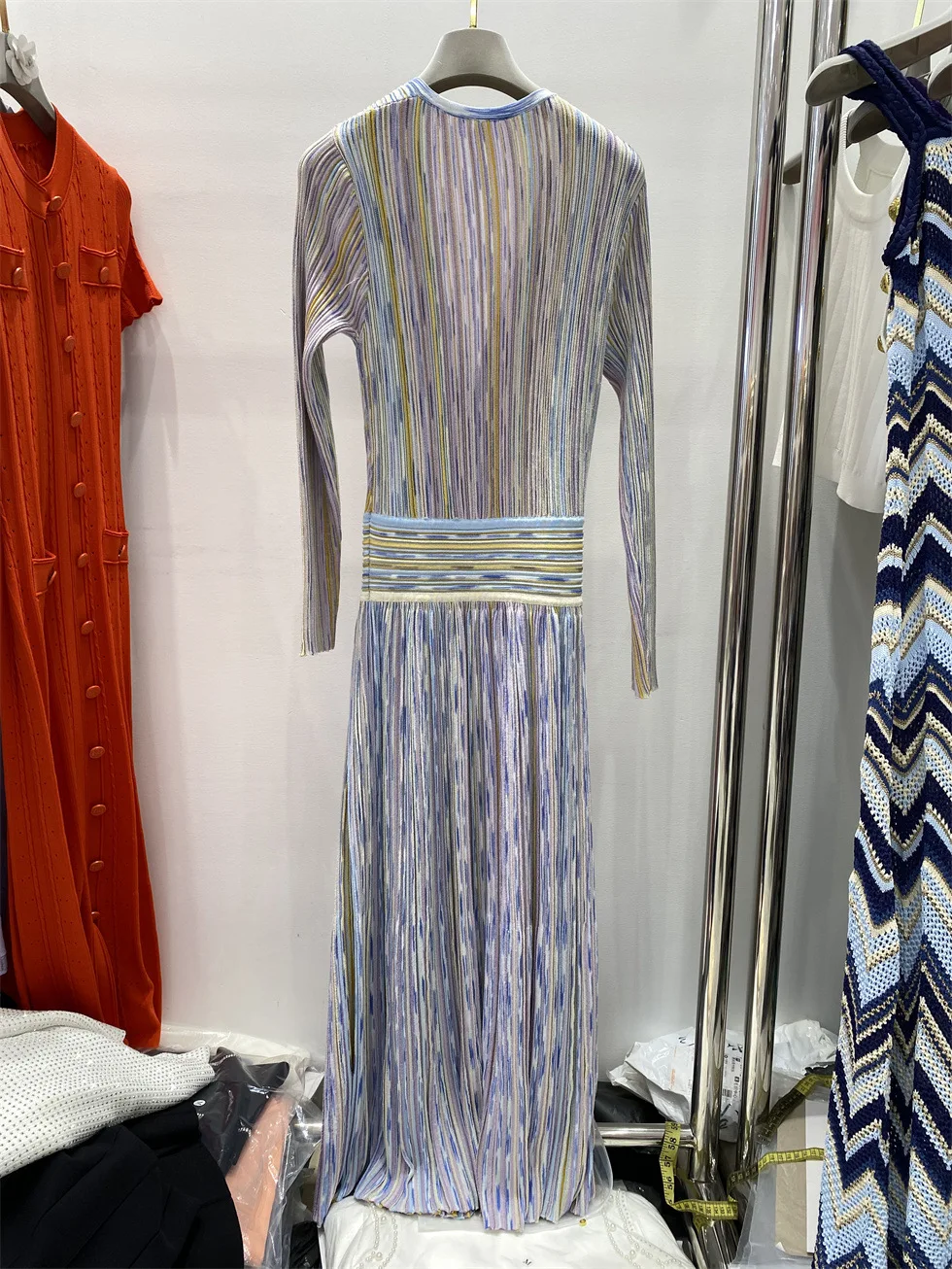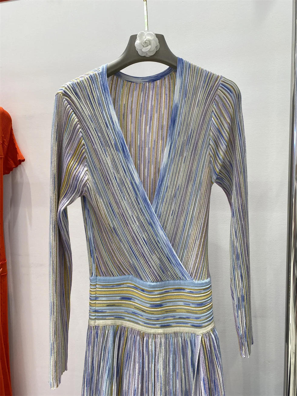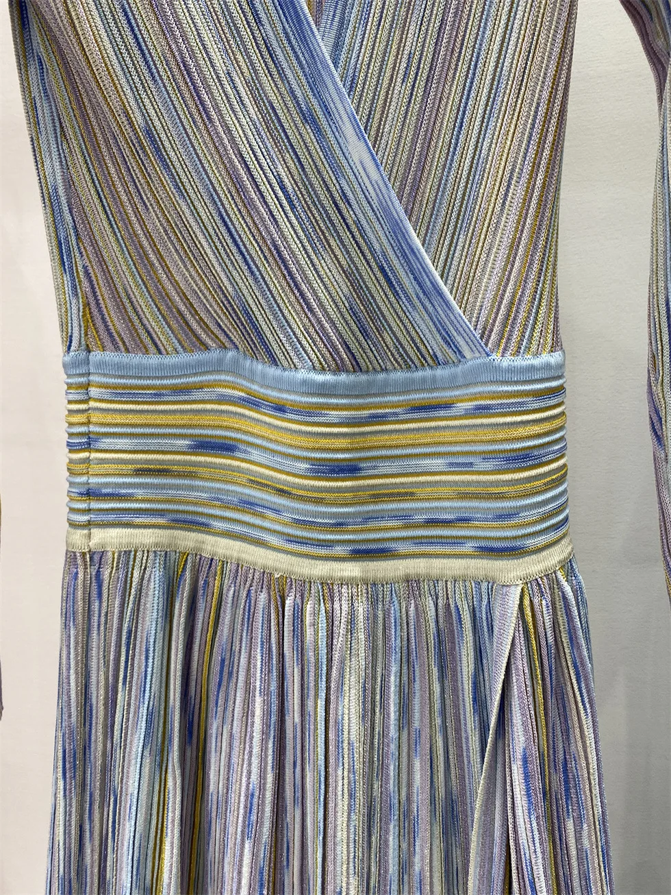 V-neck Long Sleeve Maxi Dress Colorful Striped Knitted