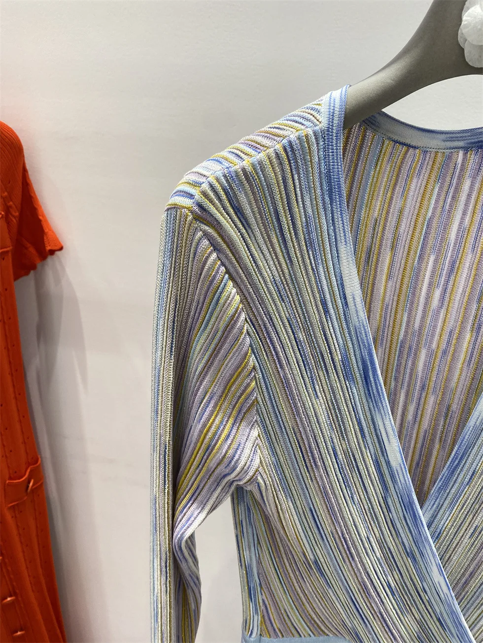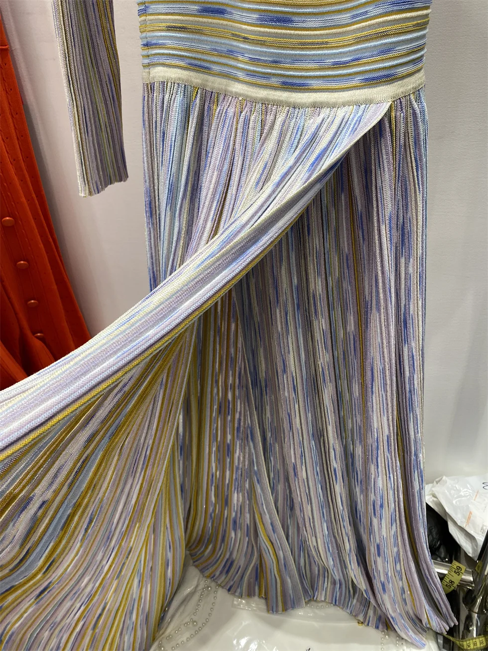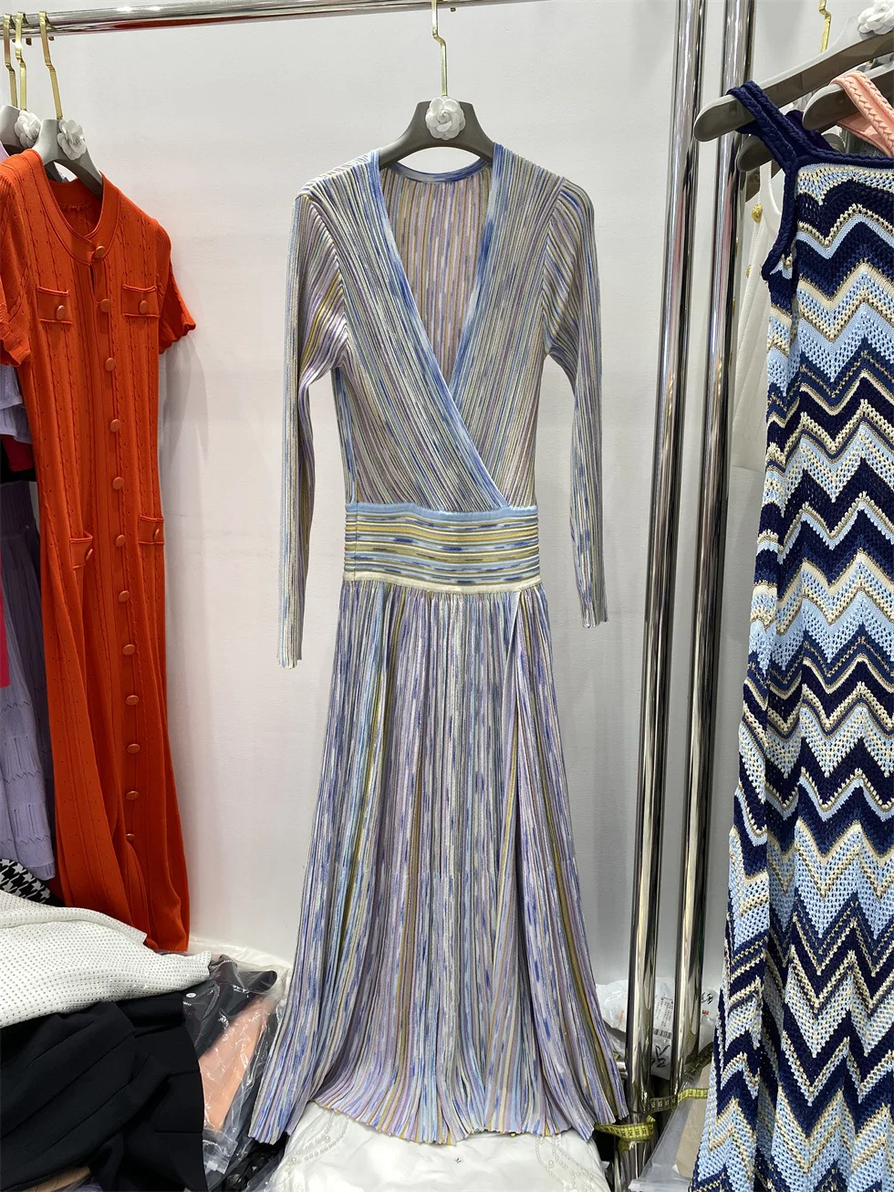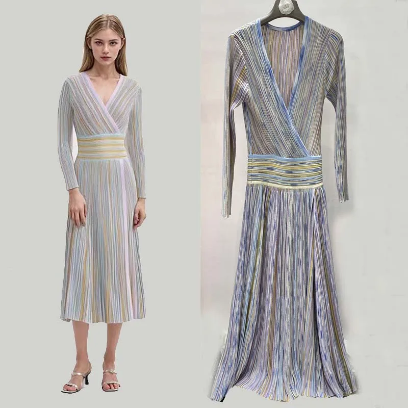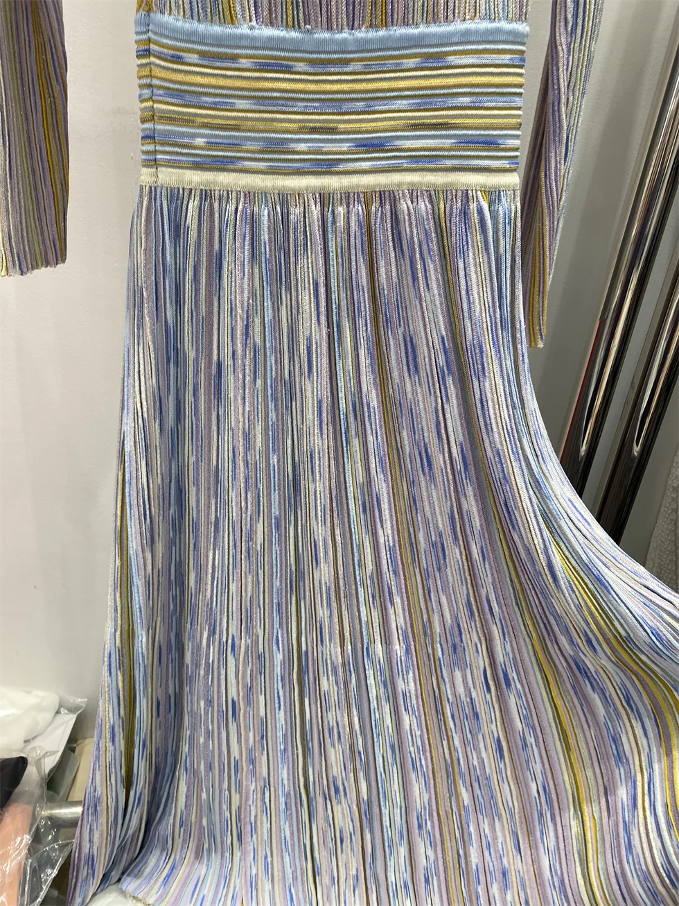 V-neck Long Sleeve Maxi Dress Colorful Striped Knitted
